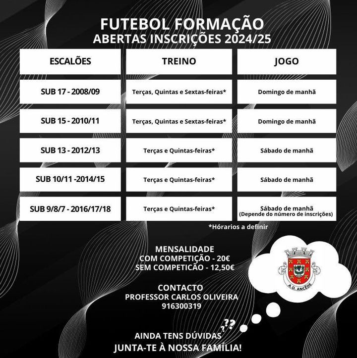 A Associação Desportiva de Ancede tem abertas as inscrições para os escalões de formação, para a época 2024/2025, com ou sem competição.