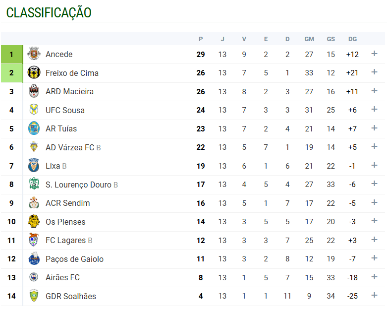A AD Ancede ocupa o primeiro lugar da tabela, com 29 pontos, conquistados em nove vitórias, dois empates e duas derrotas.